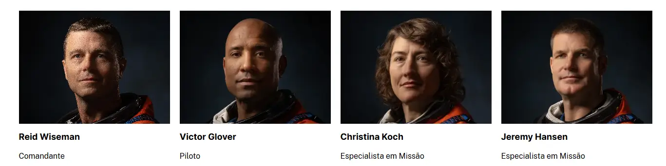 A tripulação reflete um novo momento da exploração espacial. O comandante Reid Wiseman lidera o grupo, acompanhado pelo piloto Victor Glover, pela especialista de missão Christina Koch e pelo canadense Jeremy Hansen, da Canadian Space Agency. É a primeira vez que uma mulher e um astronauta não americano participam de uma missão desse tipo ao redor da Lua.