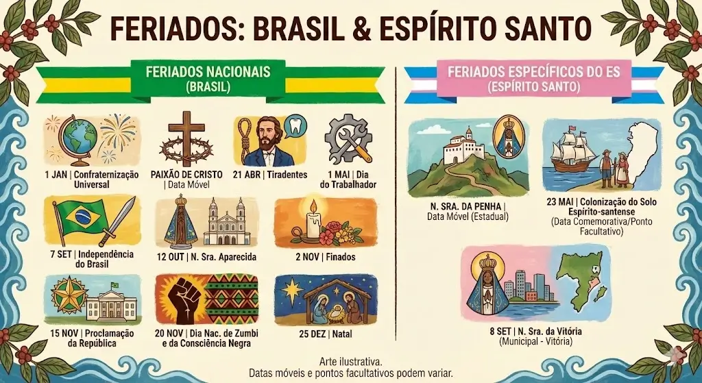 No Espírito Santo, o calendário de folgas é ampliado por dois feriados estaduais tradicionais. O primeiro é Nossa Senhora da Penha, padroeira do estado, celebrado em 8 de abril, que em 2026 cairá em uma quarta-feira. O segundo é o Dia de Nossa Senhora da Conceição da Praia, padroeira de Vitória, comemorado em 8 de dezembro, uma terça-feira, feriado municipal na capital capixaba.