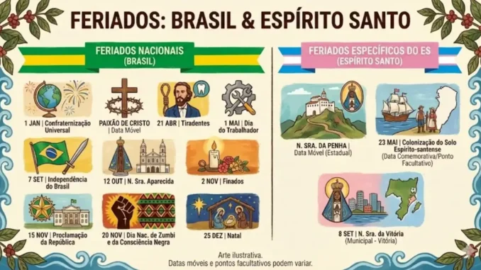 No Espírito Santo, o calendário de folgas é ampliado por dois feriados estaduais tradicionais. O primeiro é Nossa Senhora da Penha, padroeira do estado, celebrado em 8 de abril, que em 2026 cairá em uma quarta-feira. O segundo é o Dia de Nossa Senhora da Conceição da Praia, padroeira de Vitória, comemorado em 8 de dezembro, uma terça-feira, feriado municipal na capital capixaba.