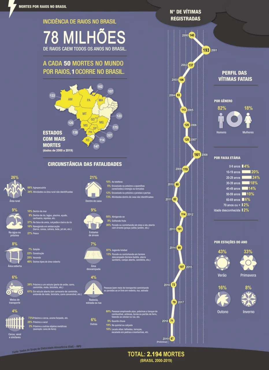 Além disso, a descarga elétrica não precisa cair diretamente sobre a pessoa. Ela pode se propagar pelo solo, por estruturas metálicas ou pela rede elétrica. Por isso, os acidentes costumam ser fatais.