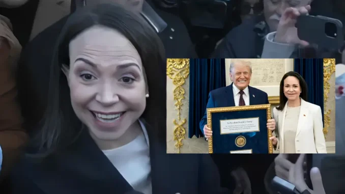 Agora imagine: em vez de usar essa honra para fortalecer sua causa, ela resolveu… entregar a medalha a Donald Trump — sim, entregar literalmente o prêmio físico nas mãos de um dos políticos mais polarizadores do planeta — em um encontro na Casa Branca.